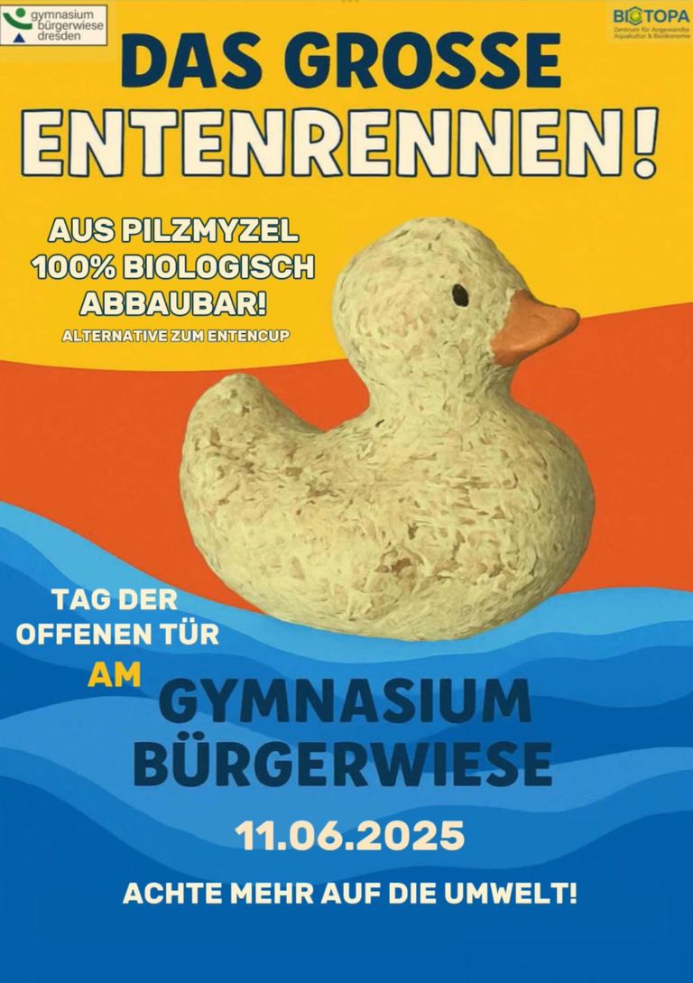 Die Schülerinnen Lilo und Mathilde (Klasse 11) vom Gymnasium Bürgerwiese haben erfolgreich das Projekt Myzelente bei Jugend Forscht 2026 vor. Es gab den 2. Platz. Außerdem haben sie ihre Komplexe Leistung zum Thema bei uns realisiert. Im Projekt werden Enten aus Pilzmyzel produziert z.B. für eine Entenrallay auf der Elbe oder auch anderen Flüssen. Das Projekt geht auch 2026 und 2027 weiter und soll für weitere Schulen entwickelt werden,